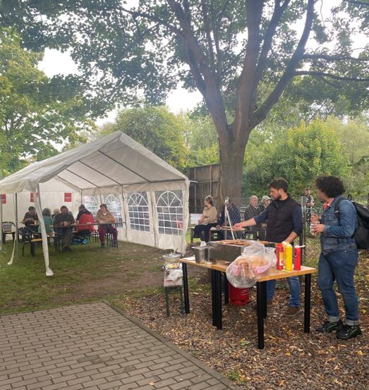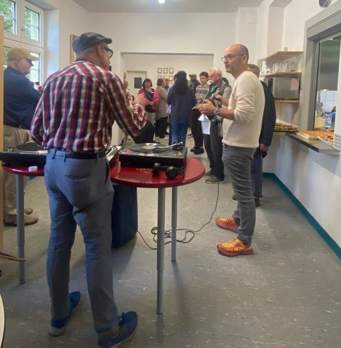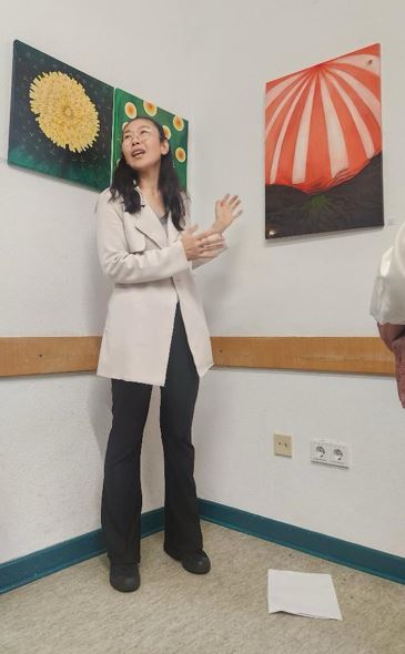 Zur Ausstellungseröffnung legte DJ Theofilo Talamonti noch echtes Vinyl auf und sorgte damit für den besonderen Hörgenuss. Auch die Außenanlage der Wohnungsnotfallhilfe war in den Tag der Begegnung eingebunden. Fachdienstleiter Alexander Becker ist dankbar für die Unterstützung durch Klienten, die das Team bei der Vorbereitung und dem Aufbau erfahren hat. „Es war ein durchweg positiver Tag der Partizipation, an dem alle Beteiligten im besten Sinne ihre Alltagssorgen vergessen konnten.“ Dazu gehört in seinen Augen auch, dass die Besucher bei Essen und Getränken miteinander ins Gespräch kommen konnten. Dass die aktuelle Ausstellung zustande kommen konnte, ist vor allem Dr. Young Sun Woo zu verdanken, die als Sozialhelferin in der TAS arbeitet, wie Schneider betonte: „Ohne Dein Engagement würde nicht ein Bild hier hängen“, bedankte er sich bei der Kollegin: „Du hast nicht nur den Kontakt und die ganze Kommunikation zu den Künstlerinnen und Künstlern durchgeführt, Du bist auch nach Südkorea gereist und hast jeden Künstler vor Ort aufgesucht und Werke eingesammelt!“ Vor allem freute er sich darüber, dass zwei der Künstlerinnen vor Ort waren. Yang-Ok Sohn ist dafür aus Südkorea angereist, Juju Park dagegen lebt in Marburg. Beide hatten zudem mitgeholfen, die Kunstwerke für die Ausstellung zu arrangieren.