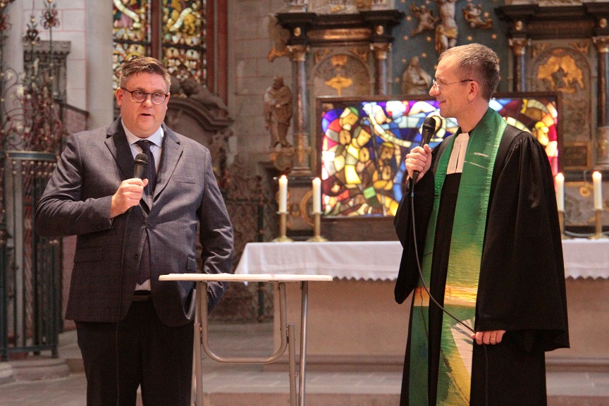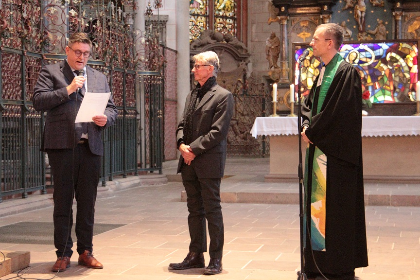 Thomas Klämt-Bender,Referent für Diakonie in der Region Kurhessen-Waldeck, überbrachte Grüße der Diakonie Hessen. Er verdeutlichte die aktuell schwierige Finanzlage für Träger sozialer Angebote. Darüber hinaus erinnerte er an die 10 Jahre zurückliegende Fusion der beiden Diakonischen Werke im Landkreis Marburg-Biedenkopf über die Kirchengrenzen hinweg. Dadurch sei eine große Vielfalt an Angeboten entstanden. Seine Vision: „Das Beste aus beiden Kirchenwelten zusammenführen.“ Oberbürgermeister Dr. Thomas Spies erklärte, Diakonie sei gelebte, praktizierte Nächstenliebe und für die Stadt ein unverzichtbarer Baustein. Er wünschte sich weiterhin eine konstruktive Zusammenarbeit mit dem evangelischen Wohlfahrtsverband, der wichtige Aufgaben übernähme, welche die Stadt so nicht übernehmen könne. Dr. Corinna Zander und Bernd Wachtel vom Caritasverband erklärten: „Uns verbindet der gemeinsame Einsatz für Menschen.“ Sie wünschten Spreda Mut für neue Wege und Menschen an seiner Seite, die mit ihm Verantwortung übernehmen. Nach dem Gottesdienst hatten die Gäste noch die Gelegenheit zu einem geselligen Austausch mit einem kleinen Imbiss.