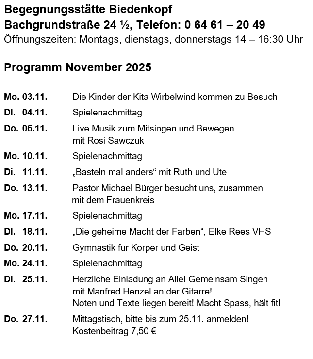Telefon während der Öffnungszeiten der Begegnungsstätte: 0 64 61 – 20 49